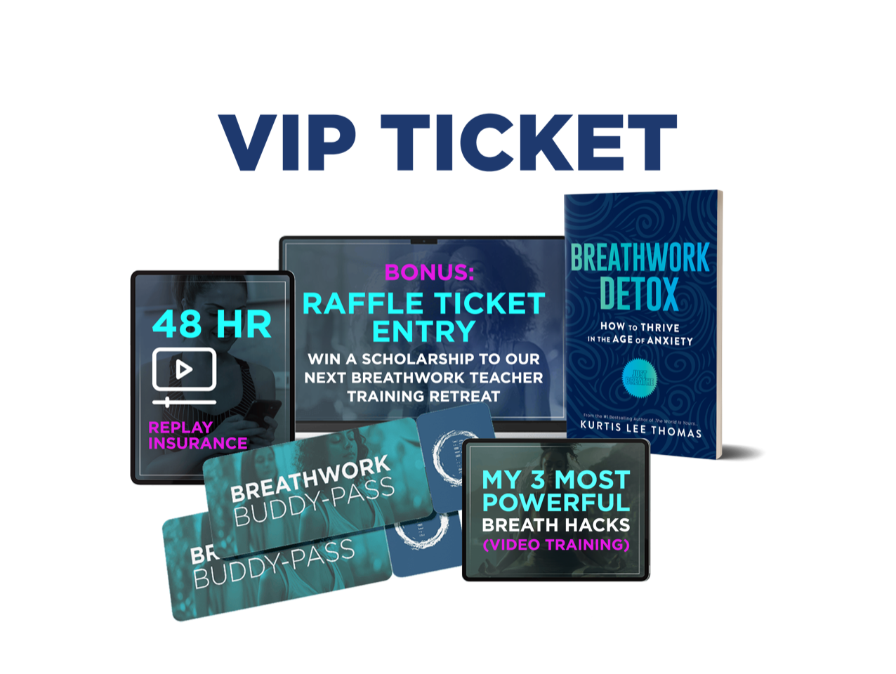 By choosing the Backstage Pass Experience, you gain not just access to the event but also exclusive features like a 48-hour event replay, a FREE Buddy Pass, Instant Download video training of My 3 Most Powerful Breath-Hacks, Instant Download of "Breathwork Detox: How to Thrive in the Age of Anxiety", and a raffle ticket entry for the chance to win a scholarship to our next Breathwork Teacher Training Retreat.